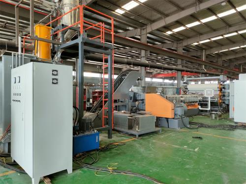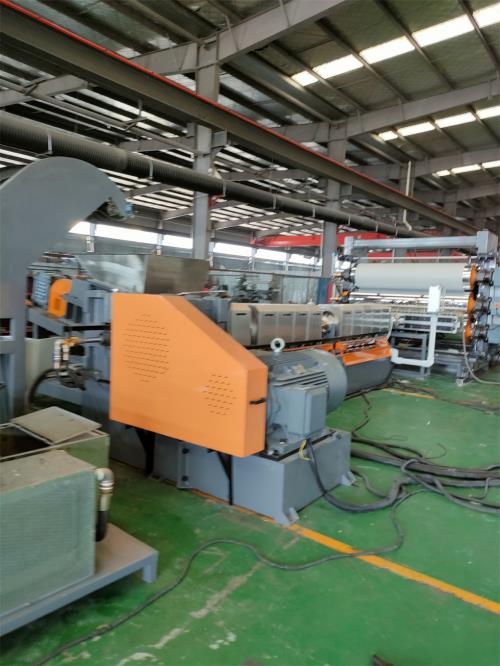 微調(diào)為手動(dòng),并兩端可單獨(dú)調(diào)節(jié),調(diào)節(jié)范圍0-70mm,2) 輥筒間隙調(diào)整采用絲桿結(jié)構(gòu),手動(dòng)微調(diào),微調(diào)范圍:1-5mm,密煉片材擠出機(jī)刻度盤(pán)指示5、移動(dòng)組件1) 整個(gè)移動(dòng)組件由傳動(dòng)系統(tǒng)、滾輪升降組件等組成, 傳動(dòng)電機(jī)功率:0.37kw,采用雙級(jí)減速器傳動(dòng),移動(dòng)平穩(wěn),亦可手動(dòng)微調(diào)2) 三輥前后移動(dòng)導(dǎo)軌要求長(zhǎng)度為:2500mm;導(dǎo)軌上要有預(yù)留固定孔;方便在客戶(hù)現(xiàn)場(chǎng)安裝膨脹螺(七)輥筒控溫裝置(三組/套)1) 輥筒的控溫由水溫控制箱來(lái)完成,最高控制水溫90℃,水泵采用高壓大流量不銹鋼多級(jí)離心熱水泵;電機(jī)功率:2.2kw*3 水泵流量:10.0m3/h,高溫水泵:2) 輥筒控溫水進(jìn)出口采用高溫旋轉(zhuǎn)接頭,確保不滲漏,模溫機(jī)與三輥;進(jìn)水;出水采用2寸軟管連接(八)冷卻輥牽引1) 牽引電機(jī)功率:3kw,采用鏈條傳動(dòng);冷卻輥直徑:400mm 輥面寬度1300mm 9個(gè);冷卻輥兩邊做安全護(hù)欄(要求:冷卻輥與輥間距越小越好)(九)雙工位收卷機(jī)1)密煉片材擠出機(jī)力矩電動(dòng)機(jī)驅(qū)動(dòng),電機(jī)功率:3KW,配氣漲軸:2支2)最大卷徑:500mm最高線(xiàn)速度:V=10米/分。碳酸鈣母粒造粒機(jī) http://m.cnhoho.com/contents/66/149.html