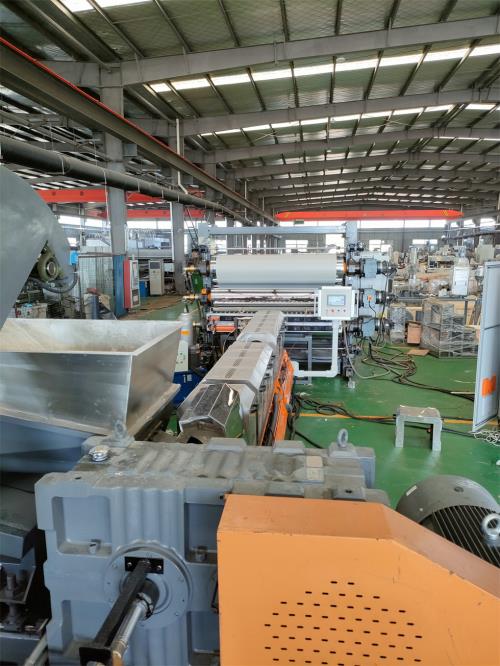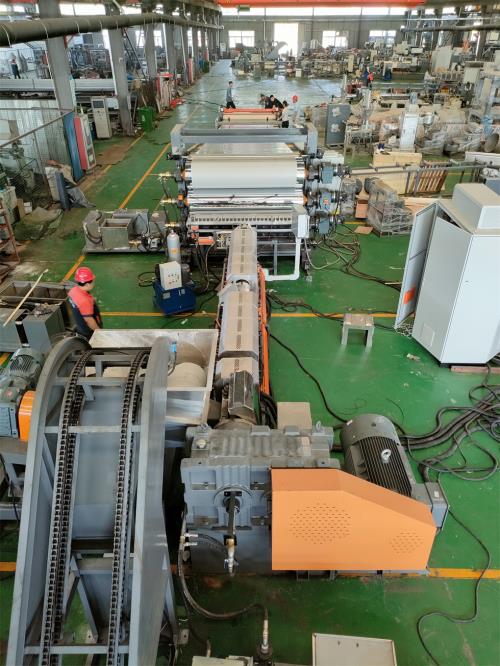 密煉片材生產(chǎn)線_密煉片材擠出機(jī)_佳德110升密煉機(jī)/JDL-150單螺桿片材生產(chǎn)線、系統(tǒng)機(jī)組技術(shù)參數(shù)Ⅰ、機(jī)器顏色:主機(jī)為:公司標(biāo)色;電柜為:電腦色;防護(hù)罩:黃色Ⅱ、擠出工藝:110升密煉機(jī)-——自動(dòng)提升機(jī)——錐雙喂料機(jī)——150單螺桿擠出機(jī)——液壓板式換網(wǎng)系統(tǒng)------片材擠出模具-----三輥壓光------三輥冷卻系統(tǒng)-----下覆膜裝置-------托架冷卻------冷卻牽引-----切邊裝置-------計(jì)米器------在線剪板機(jī)------輸送帶-------主機(jī)采用:PLC控制Ⅲ、加工物料:POE汽車內(nèi)飾片材,EVA內(nèi)飾片材 要 求:制品寬度:2000mm 制品厚度:0.8-6mm產(chǎn) 能:600~900公斤/小時(shí) 注意事項(xiàng):取決于客戶的配方、工藝、密煉片材生產(chǎn)線_密煉片材擠出機(jī)_佳德生產(chǎn)條件設(shè)備特點(diǎn):這套設(shè)備主機(jī)是環(huán)保型;整套設(shè)備不需要接外循環(huán)水系統(tǒng);自帶循環(huán)冷卻統(tǒng)是我公司專利產(chǎn)品(發(fā)明專利號(hào):CN201911312134.6)1.最大好處:主機(jī)0水排放;無(wú)水污染;環(huán)保好過(guò)2.齒輪箱冷卻采用:采用環(huán)保冷卻系統(tǒng)(環(huán)保型:發(fā)明專利號(hào):CN201911312134.6)不需要接外循環(huán)水冷卻,不用徘外水;采用閉環(huán)循環(huán)系統(tǒng),不用擔(dān)心長(zhǎng)時(shí)間使用水冷卻會(huì)產(chǎn)生水垢把冷卻器堵住,導(dǎo)致齒輪箱損壞3.主機(jī)水箱冷卻系統(tǒng)采用:采用環(huán)保冷卻系統(tǒng)(環(huán)保型:發(fā)明專利號(hào):CN201911312134.6)不需要接外循環(huán)水冷卻,